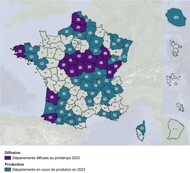 La diffusion des données se poursuit annuellement avec une trentaine de nouveaux départements prévus en 2025, soit une couverture des deux-tiers de la surface de l'hexagone avec 5 régions complètes ainsi que le premier Département d’Outre-mer. La cartographie sera ensuite mise à jour régulièrement.
