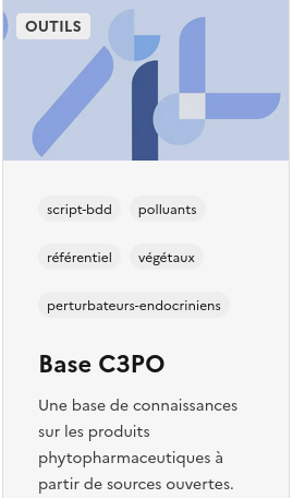 L'OFB a ainsi porté un projet de base de connaissances sur les produits phytopharmaceutiques à partir de sources ouvertes (C3PO), réunissant des informations de référence sur les PPP et les pesticides issues des bases de données suivantes : BNV-D (base « socle » du projet), Agritox, E-phy, référentiels “paramètres “ et “groupes de paramètres” du Sandre, EU Pesticides Database, tableau d’entrées harmonisées disponible à l’annexe VI du règlement CLP.