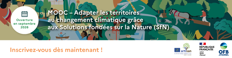 Dans le cadre du projet LIFE ARTISAN, l’Office français de la biodiversité (OFB) organise le MOOC « S'adapter au changement climatique avec les Solutions fondées sur la Nature », dont la diffusion est prévue en septembre 2026. Cette formation en ligne, 100% gratuite, vous accompagnera pour comprendre, agir et transformer vos pratiques grâce aux SfN. Elle sera disponible sur la plateforme de formation en ligne de l’OFB.