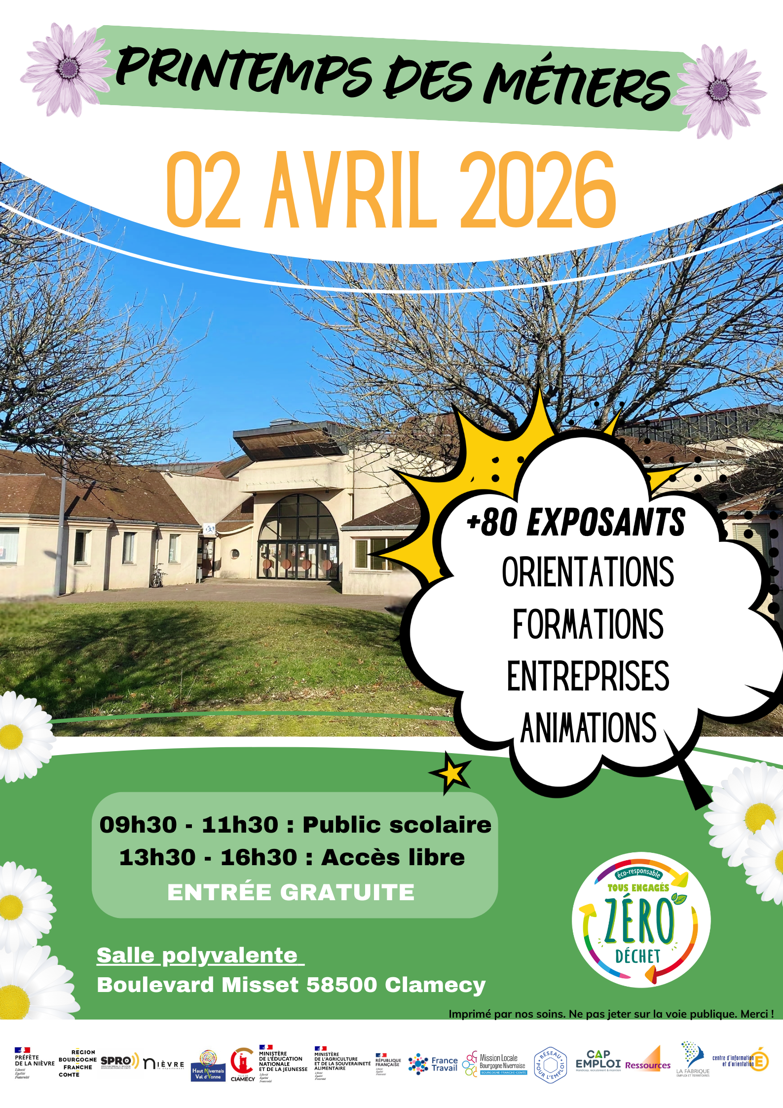 Portée par la Communauté de Communes Haut Nivernais Val d'Yonne, la troisième édition du Printemps des métiers aura lieu le jeudi 2 avril 2026, dans la salle polyvalente de Clamecy. Cet événement à destination des publics scolaires, des demandeurs d’emploi et du grand public est un forum dédié à l’orientation, à la formation et à l’emploi.