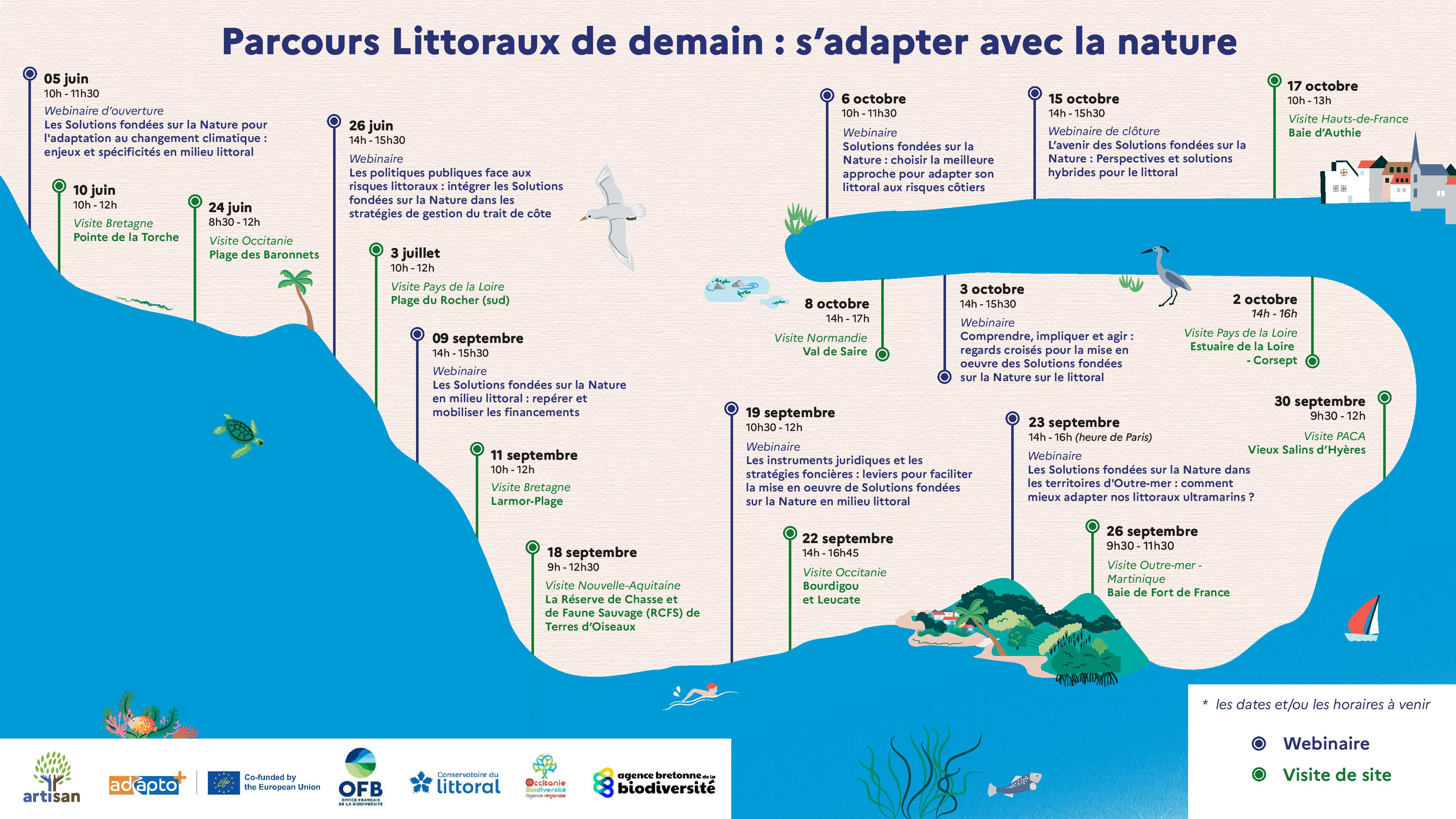 5 juin de 10h à 11h30 : Webinaire d'ouverture : Les Solutions fondées sur la Nature pour l'adaptation au changement climatique : enjeux et spécificités en milieu littoral ; 10 juin de 10h à 12h : Visite Bretagne : Pointe de la Torche ; 24 juin de 8h30 à 12h : Visite Occitanie : Plage des Baronnets ; 26 juin de 14h à 15h30 : Webinaire : Les politiques publiques face aux,risques littoraux : intégrer les Solutions fondées sur la Nature dans les stratégies de gestion du trait de côte ; 3 juillet de 10h à 12h : Visite Pays de la Loire : Plage du Rocher (sud) ; 9 septembre de 14h à 15h30 : Webinaire : Les Solutions fondées sur la Nature en milieu littoral : repérer et mobiliser les financements ; 11 septembre de 10h à 12h : Visite Bretagne : Larmor-Plage ; 18 septembre de 9h à 12h30 : Visite Nouvelle-Aquitaine : La Réserve de chasse et de faune sauvage de Terres d'oiseaux ; 19 septembre de 10h30 à 12h : Webinaire : Les instruments juridiques et les stratégies foncières : leviers pour faciliter la mise en œuvre de Solutions fondées sur la Nature en milieu littoral ; 22 septembre de 14h à 16h45 : Visite Occitanie : Bourdigou et Leucate ; 23 septembre de 14h à 16h (heure de Paris) : Webinaire : Les Solutions fondées sur la Nature dans les territoires d'Outre-mer : comment mieux adapter nos littoraux ultramarins ? ; 26 septembre de 9h30 à 11h30 : Visite Outre-mer - Martinique : Baie de Fort-de-France ; 30 septembre de 9h30 à 12h : Visite PACA : Vieux salins d'Hyères ; 2 octobre de 14h à 16h : Visite Pays de la Loire : Estuaire de la Loire - Corsept ; 3 octobre de 14h à 15h30 : Webinaire : Comprendre, impliquer et agir : regards croisés pour la mise en œuvre des Solutions fondées sur la Nature sur le littoral ; 6 octobre de 10h à 11h30 : Webinaire : Solutions fondées sur la Nature : choisir la meilleure approche pour adapter son littoral aux risques côtiers ; 8 octobre de 14h à 17h : Visite Normandie : Val de Saire ; 15 octobre de 14h à 15h30 : Webinaire de clôture : L'avenir des Solutions fondées sur la Nature : Perspectives et solutions hybrides pour le littoral ; 17 octobre de 10h à 13h : Visite Hauts-de-France : Baie d'Authie.