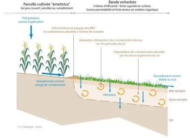 Dans le cas des zones tampons sèches, le ralentissement du flux entrant, couplé à des bonnes propriétés de perméabilité, permet à l’eau et aux contaminants qu’elle véhicule de s’infiltrer dans le sol. Pour jouer ce rôle, la capacité d’infiltration du dispositif est déterminante. Habituellement supérieure à celle d’une parcelle cultivée (ou du moins plus stable dans l’année), elle dépend en grande partie de la nature du sol (texture, pierrosité, structure, porosité) et du bon développement du système racinaire de la végétation en place. Elle est en revanche fortement réduite en cas d’engorgement du sol (hydromorphie) ou lorsque le dispositif est tassé ou endommagé par le passage d’engins ou le surpâturage. Par ailleurs, l’atténuation des flux de contaminant ne sera réellement effective que si les processus complémentaires de sorption et de dégradation se déroulent correctement dans le sol.