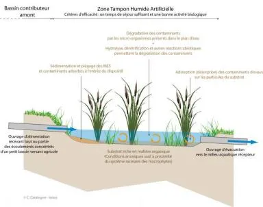 Dans le cas des zones tampons humides, les critères déterminants sont les effets de rugosité liés à la végétation en place, la géométrie du dispositif (méandrage) et le volume utile de ce dernier.