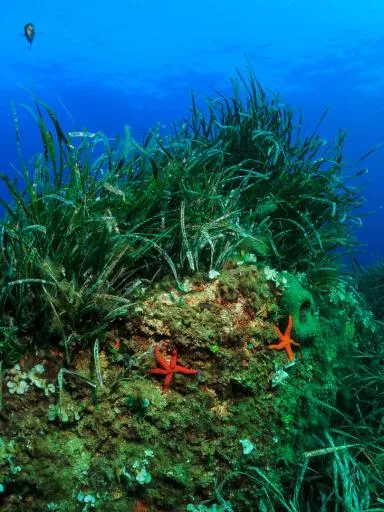Étoiles de mer rouges (Echinaster sepositus), posées sur un substrat rocheux recouvert d'un herbier de posidonie (Posidonia oceanica), PNM du cap Corse et de l'Agriate (Daniel Buron)