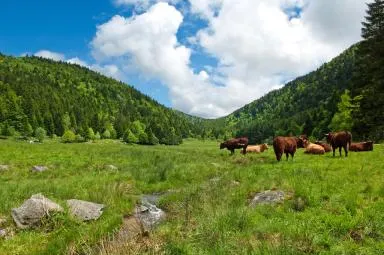 - zones de reliefs, moyenne ou haute montagne où dominent prairies et alpages et transhument les troupeaux,