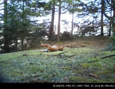 Photo de lynx se roulant obtenue par piégeage photographique, outil de collecte d’indice de présence (OFB)