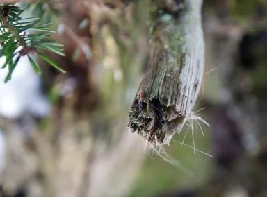 Poils de lynx sur une branche, qui seront récoltés pour analyse génétique (S. Gatti, OFB)