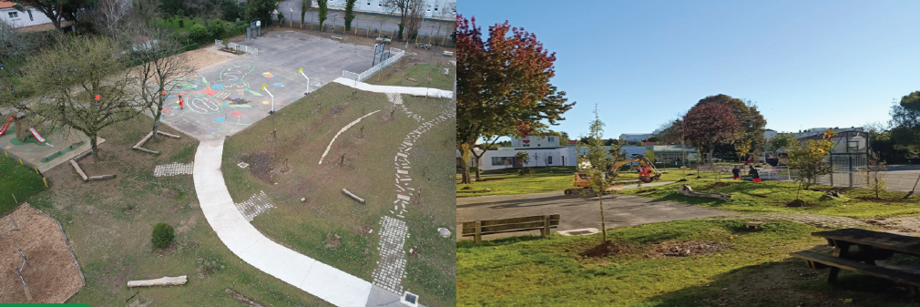 Produit par Anaïs Lucas, animatrice régionale ARTISAN Pays-de-la-Loire, ce focus territorial détaille succinctement la mise en oeuvre de la désimperméabilisation et la renaturation des cours d'écoles sur la Roche-sur-Yon. Ce projet SfN permet de lutter contre les îlots de chaleur, de favoriser l'infiltration des eaux pluviales mais aussi le confort thermique et l'inclusivité des espaces pour les élèves.